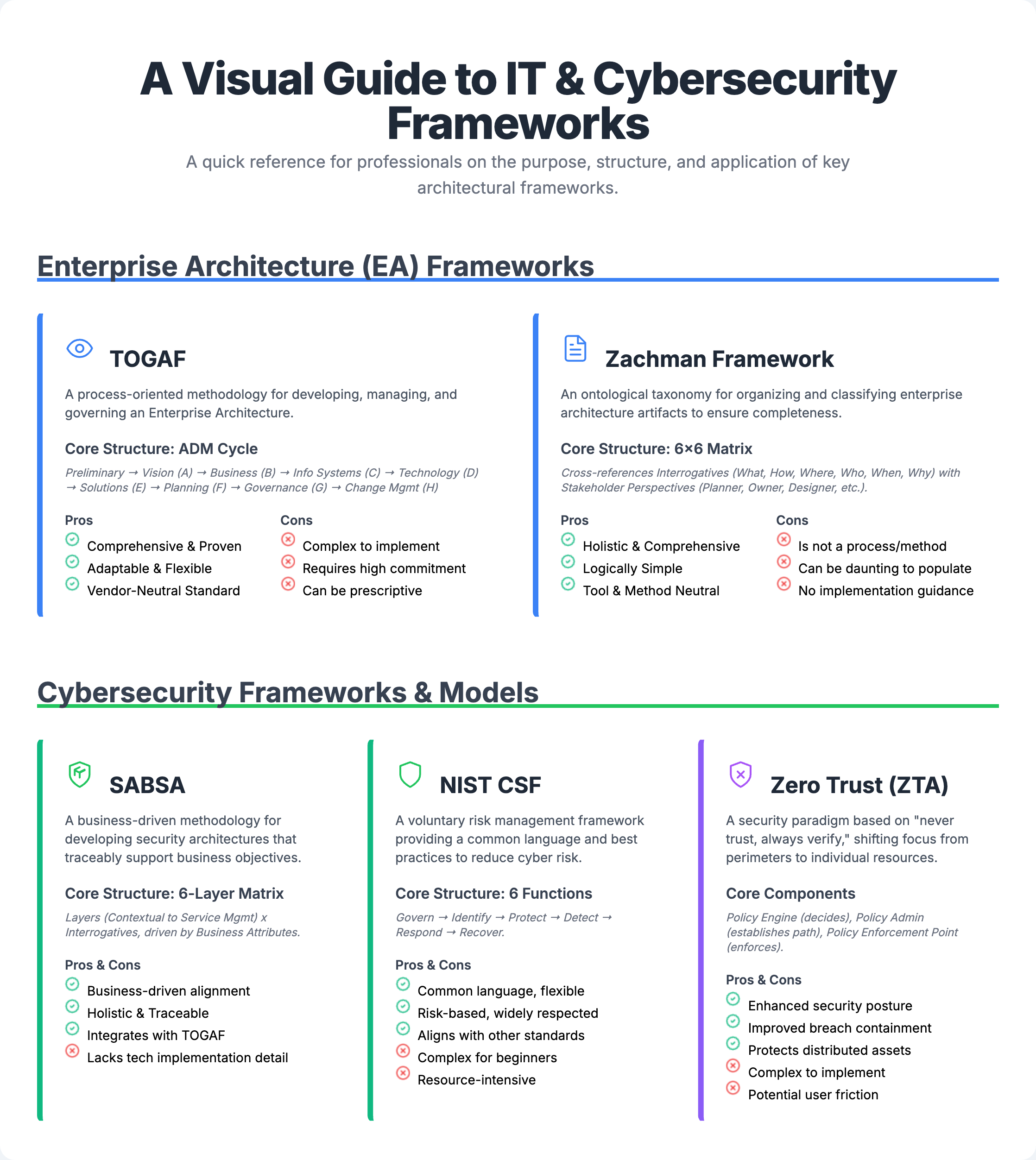This report serves as a comprehensive reference library detailing key architectural frameworks commonly employed by IT and Cybersecurity professionals. Its objective is to provide a clear understanding of these frameworks, their intended uses, benefits, limitations, and practical applications. The report is structured to first cover prominent Enterprise Architecture (EA) frameworks – The Open Group Architecture Framework (TOGAF) and the Zachman Framework – which focus on the holistic design and management of the enterprise. Subsequently, it delves into critical Cybersecurity frameworks and models – Sherwood Applied Business Security Architecture (SABSA), the National Institute of Standards and Technology (NIST) Cybersecurity Framework (CSF), and Zero Trust Architecture (ZTA) – which provide specialized guidance for managing cyber risk and designing secure systems. Each framework is analyzed consistently, covering its description and uses, pros and cons, practical application examples, and links to associated governing bodies and official guidance resources.